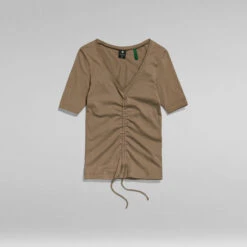 Top Adjustable Front is designed in a slim fit and offers a pull-up drawcord construction at the front. A deep V-neck is finished with a binding. The short sleeves of this top are kept slightly longer.