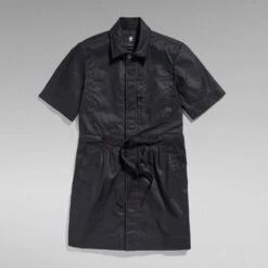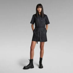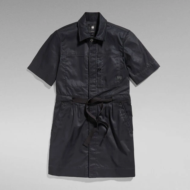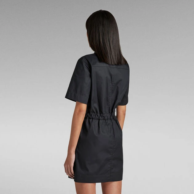This Army dress is designed in a shorter length and offers a concealed snap button closure. Additionally a woven tape is added to create a tighter waistline when preferred. This short sleeved dress shows a visible chest pocket with a side entry. At the opposite side, a patch pocket is placed at the inside. The pockets at the waist are finished with a filler cord along the edge and a rivet at the corner.