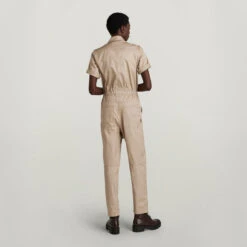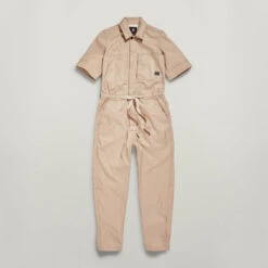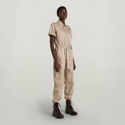 Jumpsuit Army is designed in a straight fit and offers a hidden snap front closure. An elasticated waist is combined with a tape drawstring at the front. Semi short sleeves allow for a fold over option. This overall shows many pockets. A single side entry pocket at the chest is combined with a hidden pocket at the opposite side. Waist pockets are finished with a slim piping and the back shows patch pockets. The straight fit of this jumpsuit can be slimmed by the woven drawstrings at the waist.