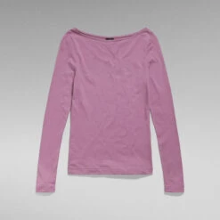 Slim top Boat offers a long sleeved design. The sleeves are slightly extended. The neckline is cut rounded in a wider shape.