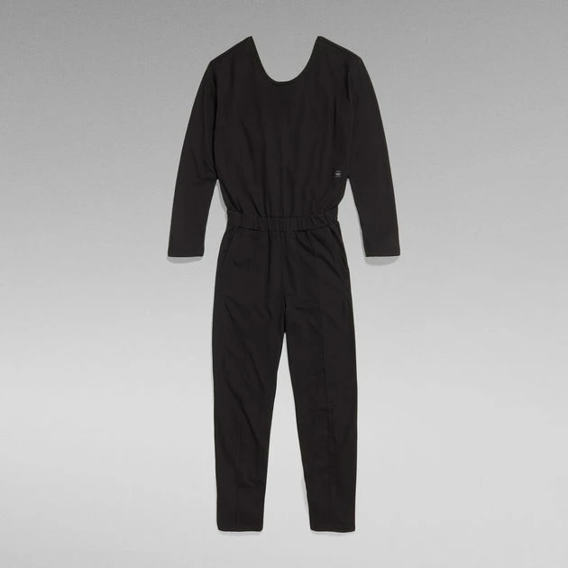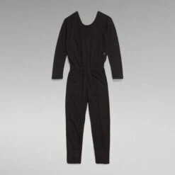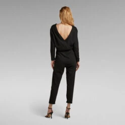 This jumpsuit is designed with slightly dropped shoulders and a wide round neck. The back side shows crossover back panels. This Bohdana suit offers an elasticated waist and side seam pockets. Folded leg hems add the final touch to this jumpsuit.