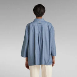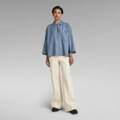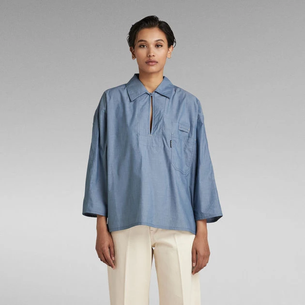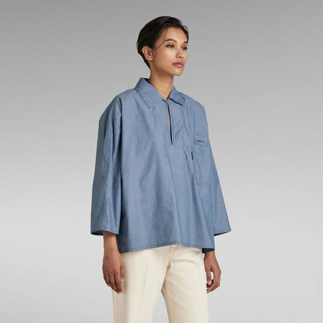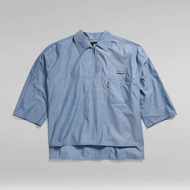 Polo Bowling is designed in a loose fit. A shirt collar is combined with a V-shaped front. The loop and button closure allow for a semi-closed neckline. This polo shows an extended back length and offers slits at the sides. A volume pleat at the back adds to the relaxed fit of this polo. The chest pocket with a loop detail above completes it.