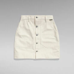Button skirt Utility is designed in a slim fit and offers a high waist. Deep pockets are patched on to the front. Also the back offers pockets. This ecru skirt has a shank button closure and is cut in an upper leg length. A belt can be added if preferred.