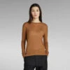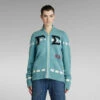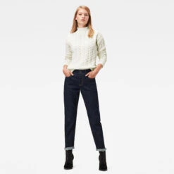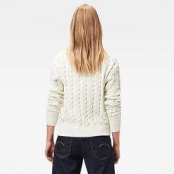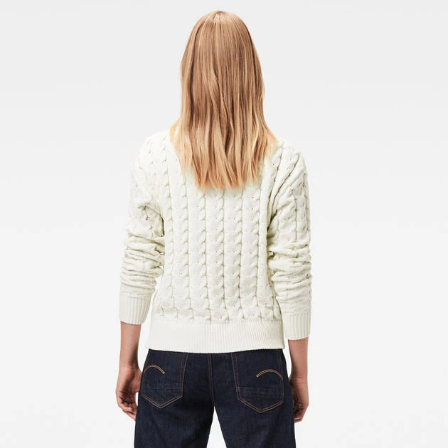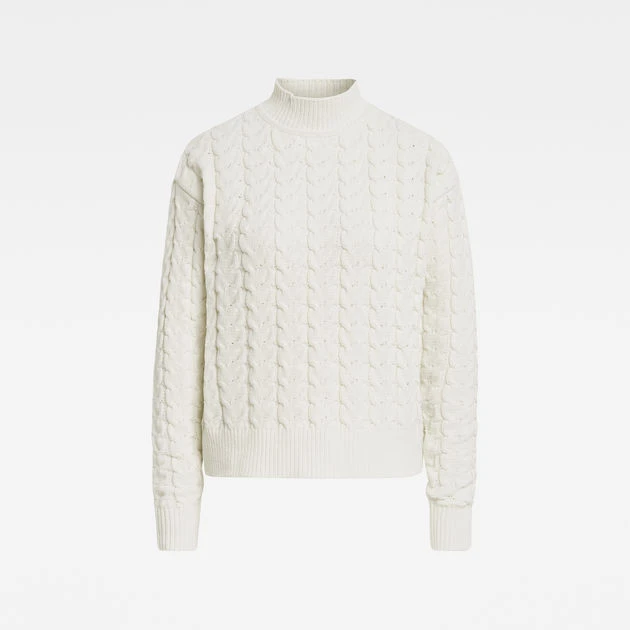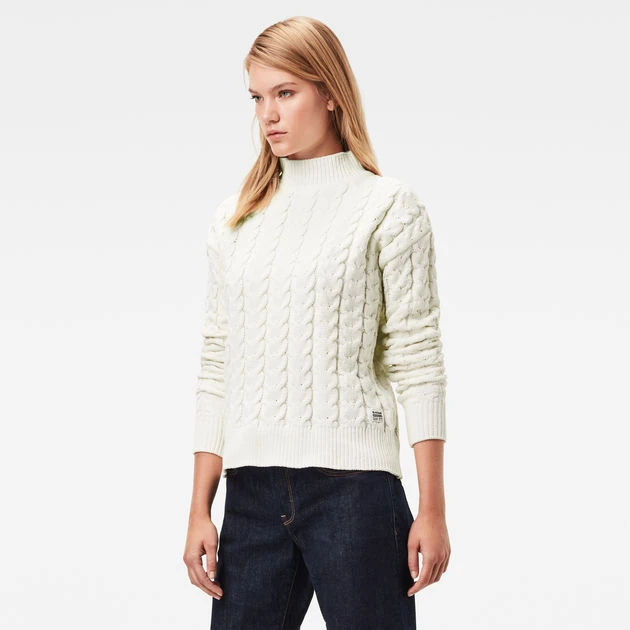 This Cable knitted sweater is designed in a cable knitted structure and shows a mock neck. A ribbed knit finishes the sleeves and waist. This sweater is made in a shorter length and shows a woven G-Star Originals label at the lower front.