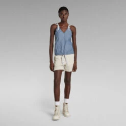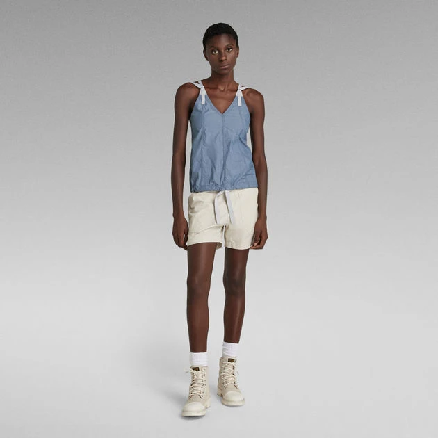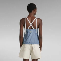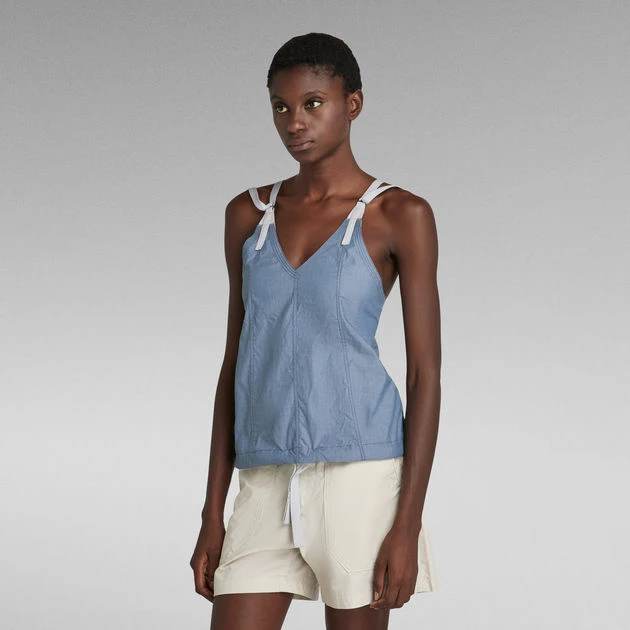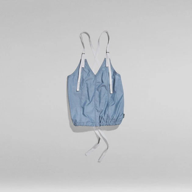 Top Chute offers an A-Line fit with a V-neck and a low back. The woven shoulder tapes allow for a personalized fit. By pulling the woven tape at the lower hem, a tighter fit with a voluminous effect can be created.