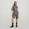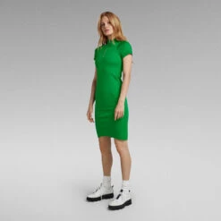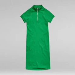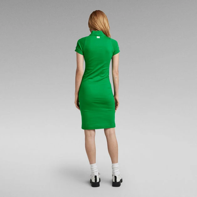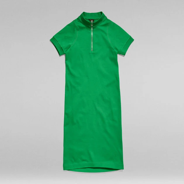 Ultra slim dress Cycling offers a mock neck with a front zipper closure. A ribbed edge is applied at the short sleeves. The bottom hem of this knee length dress is slightly curved at the back. The graphic print at the lower front completes it.