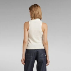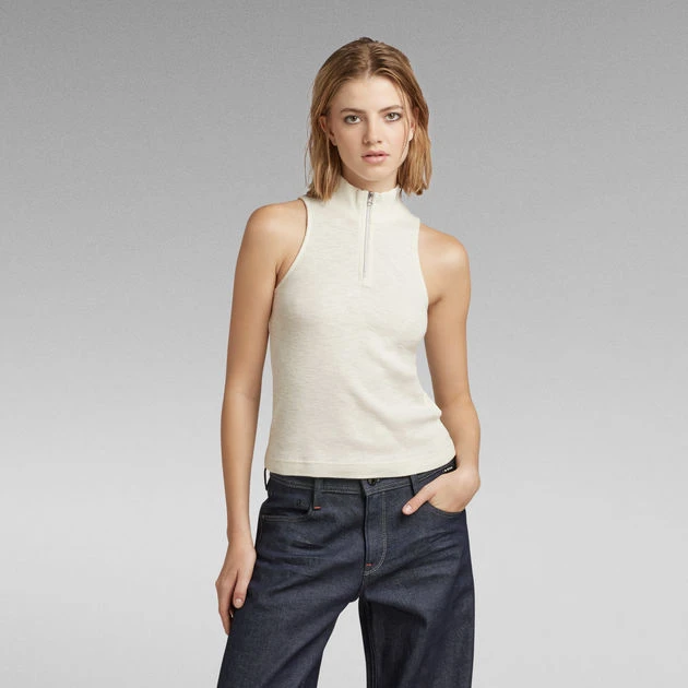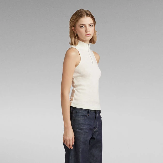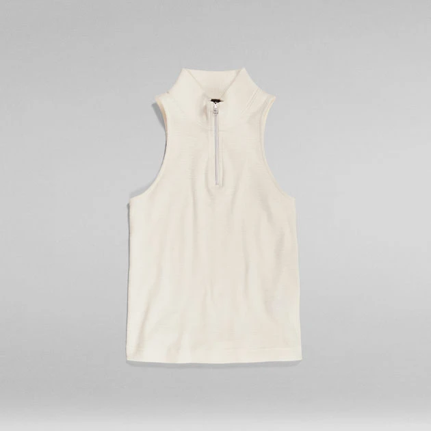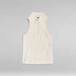 Sleeveless top Cycling offers a super slim fit with a shortened, boxy silhouette. The raised neck is finished with a short zipper. This cropped top shows a reduced shoulder width.