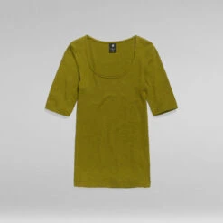 Top Deep Scoop is designed in a slim fit and offers short sleeves that are kept slightly longer. The round neckline is widened and finished with a binding.