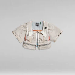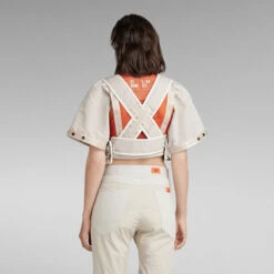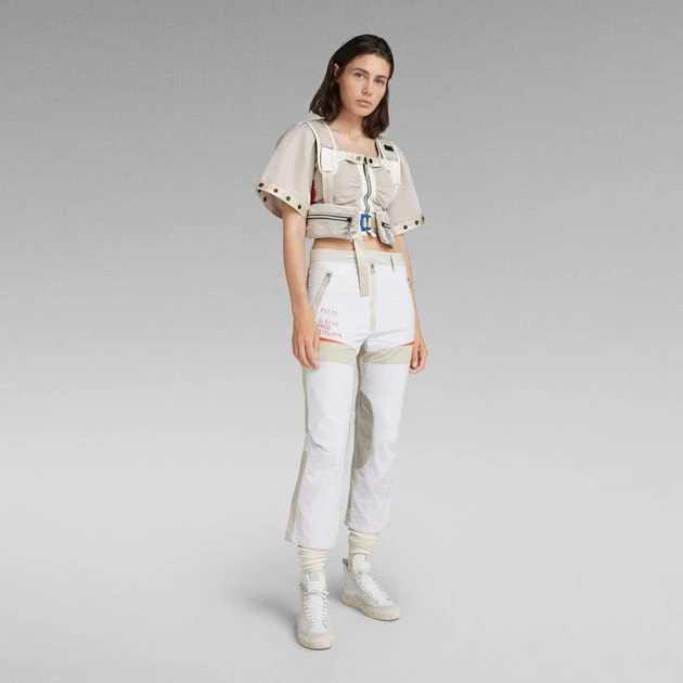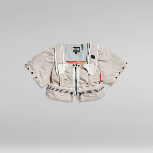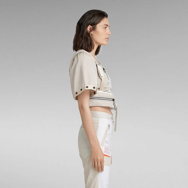 The E Battle T-Shirt is part of the Extremes collection, where timeless pieces are created by merging innovation with craftsmanship. Offering a cropped T-Shirt with a detachable harness piece. Either wear them as a set or wear the T-Shirt as is. Puff sleeves are created by the pleats that are caught in the seams. The snaps applied along the edge of the sleeve allow for a tighter cuff with voluminous pleats. This T-Shirt has a zipper closure at the front, reinforced with a broad tape alongside. The snaps at the T-Shirt allow you to fixate the harnas piece. Close the buckle at the waist for a firm closure. 3D zipper pockets are added on each side. The harness shows a cross over strap construction at the back.