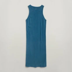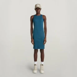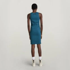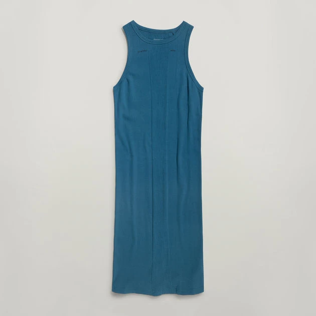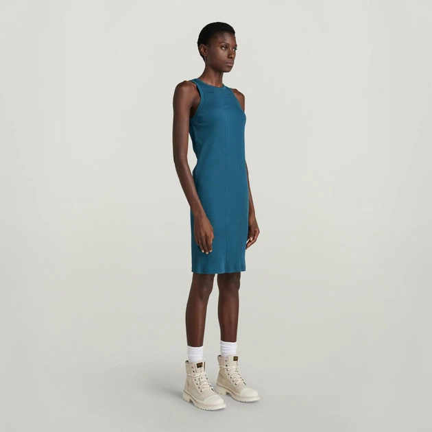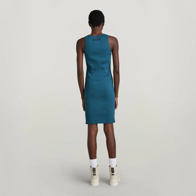 An engineered rib structure created this slim fitted tank dress. Showing a binding along the neckline and armholes. The bottom edge is kept straight. Graphic prints at the upper chest sign it off.