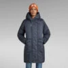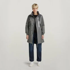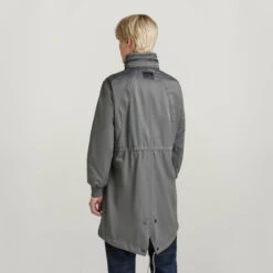 Parka Fishtail is designed in a loose fit and shows snaps at the collar to create a raised execution. Along the back, a zipper conceals a packable hood. The sleeves of this jacket are finished with a ribbed cuff. A zipper pocket is concealed behind the graphic printed tape and the waist offers flap pockets with a button closure. At the inside diagonal woven tapes are set of which the stitch down is visible on the outside. Drawstrings at the waist and hem allow for a tighter look. This jacket offers a zipper closure with a wind blocker panel.