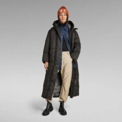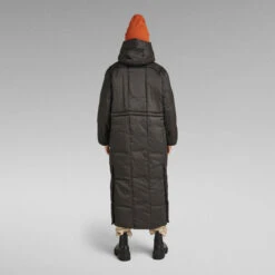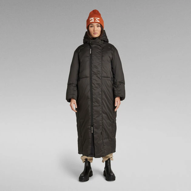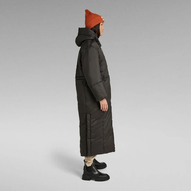 This G-Whistler extra long padded parka is cut from a water repellent fabric, offering a comfortable hood with a broad peak. The 2-way front zipper closure is covered by a panel with snaps to block out the wind. The added tab at the top secures the front neck for optimum protection. Slits are added to the sides for ease of movement. When preferred, these can be closed as there are snaps added inside. Also the waist is adjustable through the hidden puller cord. This long padded coat offers pockets at the waist as well as inside. Woven tape at the shoulder and pocket entrance add detail to the front, while the upper back shows a strap.