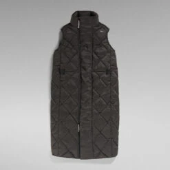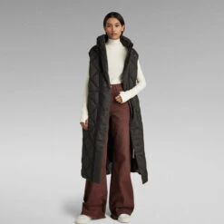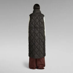 This G-Whistler extra long padded puffer is cut from a water repellent fabric, quilted in a grid structure. Offering a sleeveless design with a raised collar. The 2-way front zipper closure is covered by a panel with snaps to block out the wind. Slits are added to the sides for ease of movement. When preferred, these can be closed as there as snaps added inside. Also the waist is adjustable, as there is a puller cord hidden inside. This long sleeveless puffer offers pockets at the waist as well as inside. Woven tape at the front shoulder and pocket entrance add detail to the front, while the upper back shows a strap.