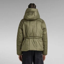 This G-Whistler short padded jacket is cut from a water repellent fabric, offering a comfortable hood with a broad peak. The front zipper closure is covered by a panel with snaps to block out the wind. The added tab at the top secures the front neck for optimum protection. Also the waist is adjustable, as there is a puller cord hidden inside. This short jacket offers pockets at the waist as well as inside. Woven tape at the shoulder and pocket entrance add detail to the front, while the upper back shows a strap.