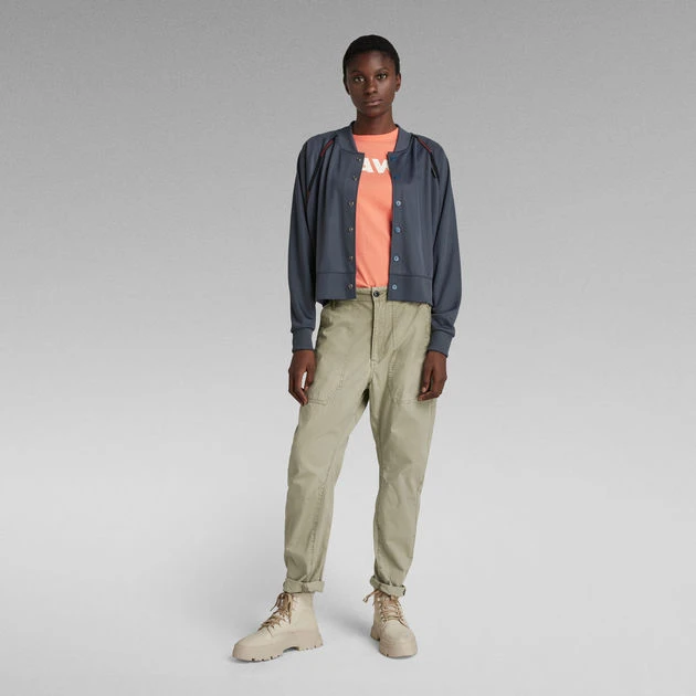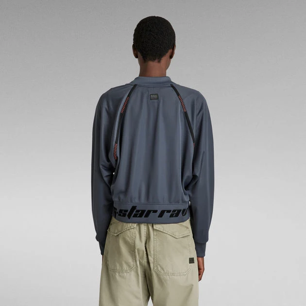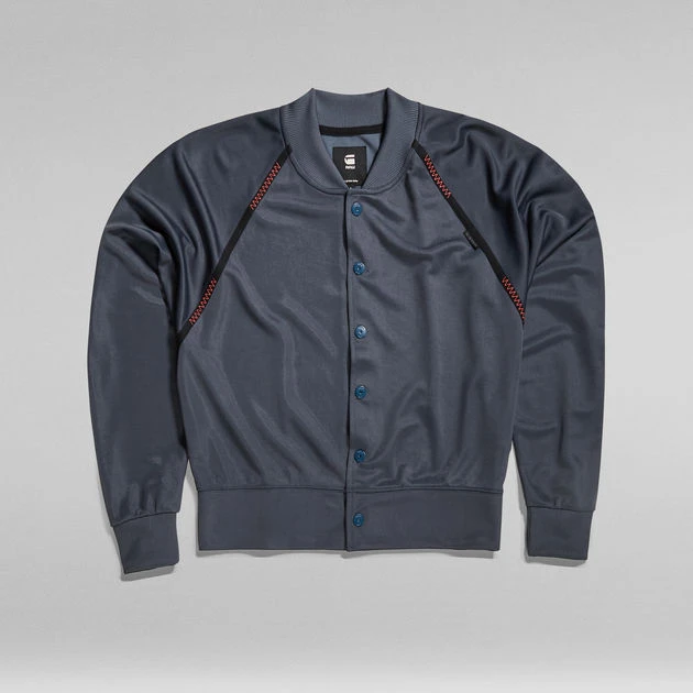 Tweeter Bomber features ribbed cuffs and a raised collar alike a bomber jacket. This lighter weight sweater jacket offers the comfortable wear of a jersey top. The seams of the raglan sleeves are reinforced with a woven tape and show zig zag stitches. This tweeter jacket has a snap button closure. The soft touch graphic print adds character to the lower back.