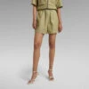 These Lynton shorts offer a boyfriend fit in a thigh length. Choose to wear it high up or as a mid waist with a slightly dropped crotch. A woven tape drawcord adds detail. Pockets are caught in the side seam, offering a hidden snap closure. The coin pocket is reinforced with rivets and the back shows patch pockets. Fold up the leg hems to complete the look.