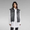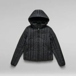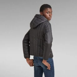 This Meefic vertical quilted jacket is cut from a water repellent fabric, stitched through in a vertical stitch down. The detachable hood offers a high raised front and puller cords for optimum protection. A broad woven tape indicates the pocket entrance at the waist. Also the front shoulders of this padded jacket show a woven insert. An elasticated binding at the sleeves and bottom edge complete this quilted jacket.