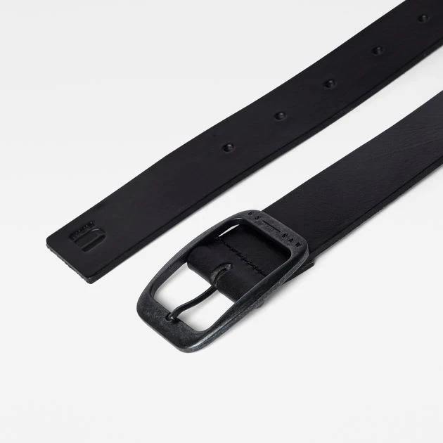 This Mett belt features a black colored metal buckle, subtle engraved with GS RAW. The full grain leather strap offers a debossed graphic at the end.