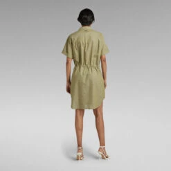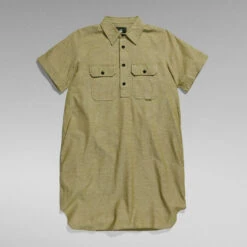 Dress Millery offers a knee length design with side slits. Semi short sleeves show a fold over edge. The shirt collar is combined with a lengthened placket and buttons. The drawcord at the waist allows for a tighter silhouette. Side seam pockets complete it.