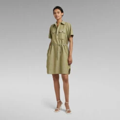 Dress Millery offers a knee length design with side slits. Semi short sleeves show a fold over edge. The shirt collar is combined with a lengthened placket and buttons. The drawcord at the waist allows for a tighter silhouette. Side seam pockets complete it.