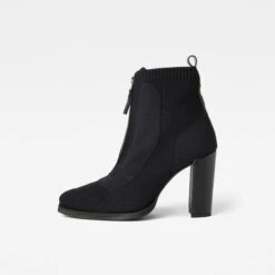 The Mysid boot presents a high heel boot in a knitted execution. Leather details are added. A front zipper combined with a pull tab at the heel create an easy access.