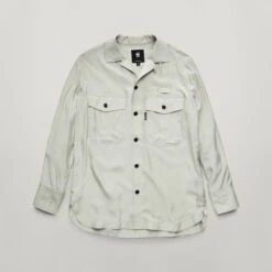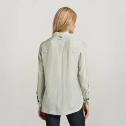 Boyfriend shirt Officer is cut in a loose fit with a curved hem and has a sewn on button closure. The cargo pockets at the chest offer a ‘stitch through’ embroidery line with a loop on top. Also at the upper back loops are added. The side slits complete it.