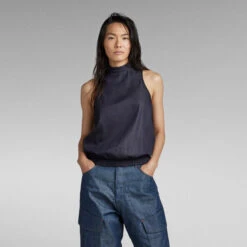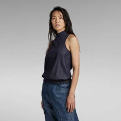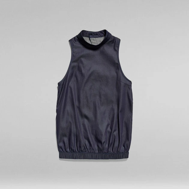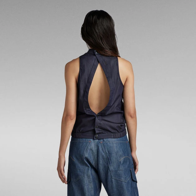 Top Open Back is a sleeveless shirt with an elasticated waist. The neck shows a band collar with a button closure at the back neck. The deep slit at the back of this sleeveless top is finished with a broad binding and offers buttons at the bottom to reduce the slit length.