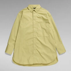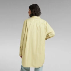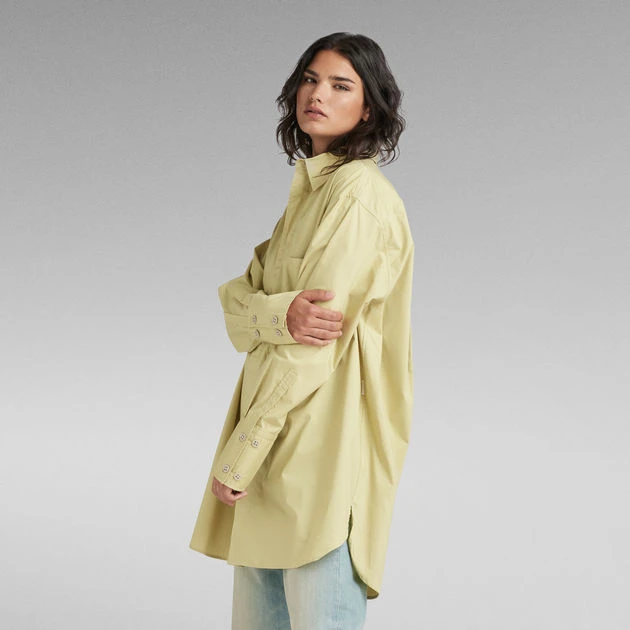 This oversized Boyfriend shirt is cut in a loose fit. The pleats that are caught in the upper back seam add to it. This shirt is extended and offers a rounded hem. A single pocket is positioned at the chest. The sleeves are finished with a high cuff that shows a double row of buttons, making a tighter fit possible.