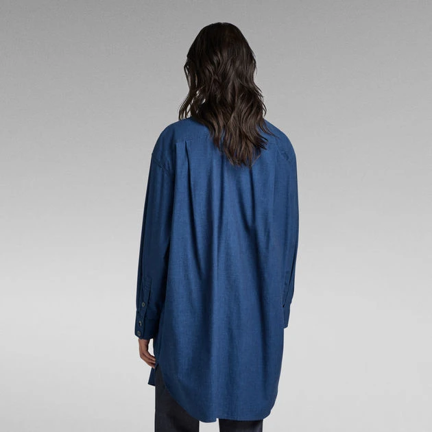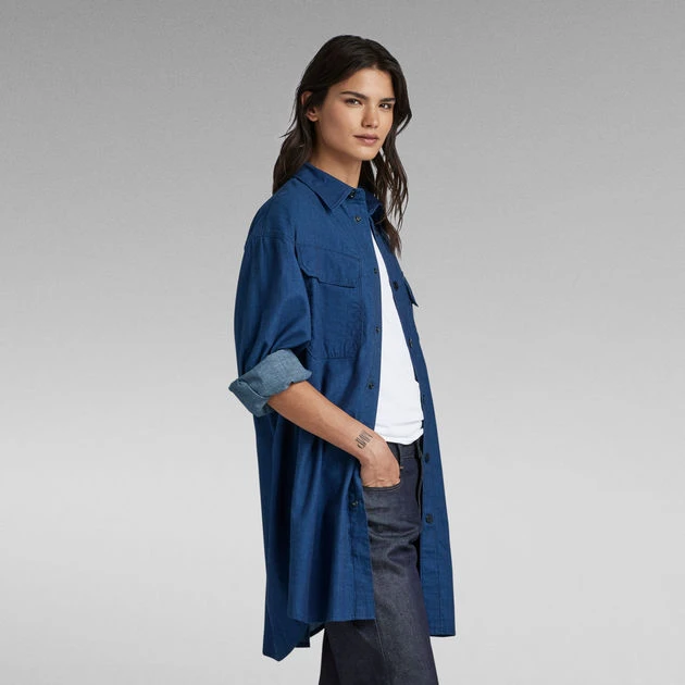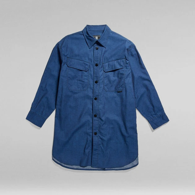 Shirt Flap Pocket Evergreen is designed in a loose, oversized fit. Flap pockets with hidden snap buttons are added to the chest. The pleat underneath the shoulder panel creates more volume at the back. A rounded hem completes this long denim shirt.