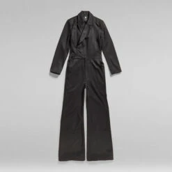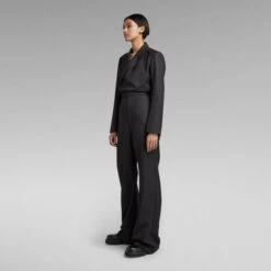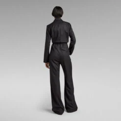 Jumpsuit Panzer is designed in a straight fit with a wide leg. Shape is created at the waist, where an elastic back is combined with a flat front. If preferred, the elastic stretch can be adjusted on the inside. This suit offers a lapel collar with hidden snaps. The inside is clean finished with a lining. Pockets are created at the front as well as the back. The folded pleat at the front shoulders and the slits at the sleeve add the finishing touch to this G-Star RAW jumpsuit.