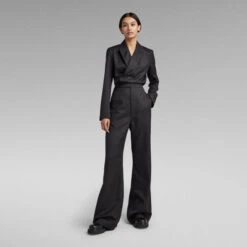 Jumpsuit Panzer is designed in a straight fit with a wide leg. Shape is created at the waist, where an elastic back is combined with a flat front. If preferred, the elastic stretch can be adjusted on the inside. This suit offers a lapel collar with hidden snaps. The inside is clean finished with a lining. Pockets are created at the front as well as the back. The folded pleat at the front shoulders and the slits at the sleeve add the finishing touch to this G-Star RAW jumpsuit.