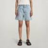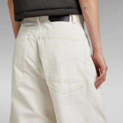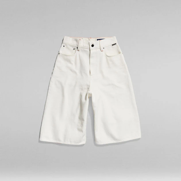 Ecru denim shorts Patti are designed in a wide fit and reach below the knees. The inset pockets are reinforced with rivets at the corners. Also the hidden coin pocket is fixated with rivets. Roomy back pockets complete it.