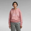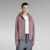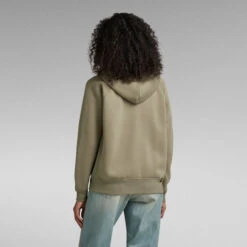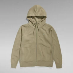 Hooded zip through sweater Premium Core 2.1 features a split kangaroo pocket and a hood with a raised front and drawstrings. The sleeves have a curved finish, showing a ribbed cuff underneath. The G-Star RAW embroidery at the chest signs it off.