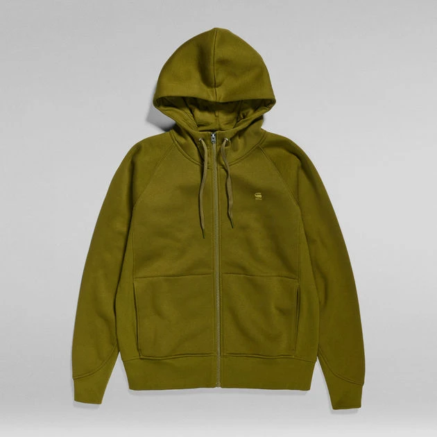 Hooded zip through sweater Premium Core 2.1 features a split kangaroo pocket and a hood with a raised front and drawstrings. The sleeves have a curved finish, showing a ribbed cuff underneath. The G-Star RAW embroidery at the chest signs this sweat jacket off.