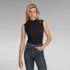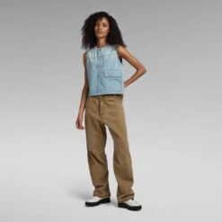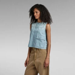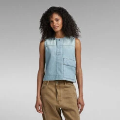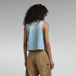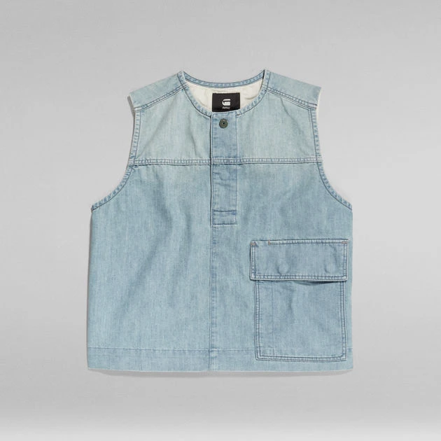 This premium sleeveless shirt is designed in a relaxed fit and offers a shorter, cropped length. A single flap pocket is added to the front and closes with a hidden snap button. Also at the placket, snaps are set. Combining a visible snap with a hidden one. Side slits complete it.