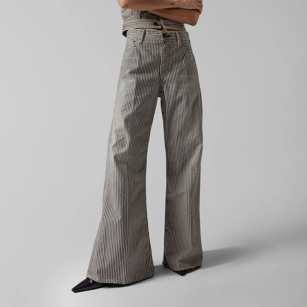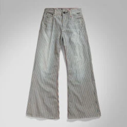 Striped indigo, finished with fades and destroyed sections.
