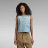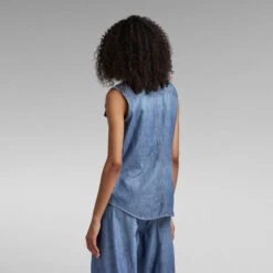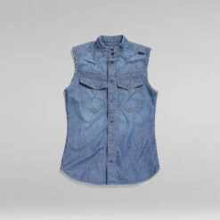 This premium sleeveless denim shirt offers a slim fit with a curved hem. Flap pockets at the chest are finished with a snap button closure. The band collar adds character.