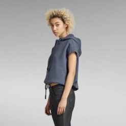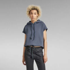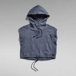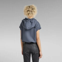 This short sleeved hoodie offers grown on sleeves with a ribbed edge. This loose fitted sweater has a lined hood with drawcords. The kangaroo pocket is set across the full front. Pull the drawcord inside the waist to create a tighter fit with more volume. The graphic print at the back adds character to this short sleeved hoodie.