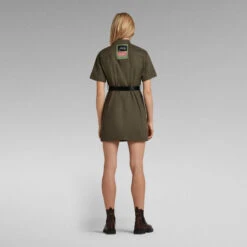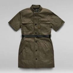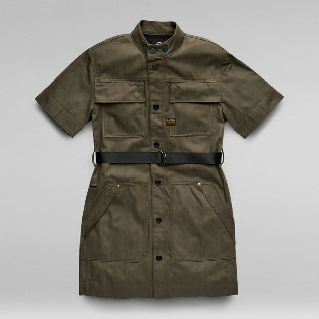 Shirt Dress Short Sleeve offers a band collar with a 2-button snap closure. This dress is designed in a straight fit, offering a woven belt at the waist. Flap pockets with a hidden snap are placed at the chest. The waist shows patch pockets with a reversed entry at the side. This dress has a full front closure of snaps.