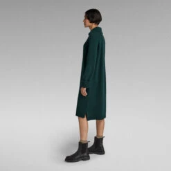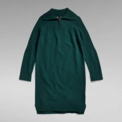 Knitted dress Skipper is designed in a loose fit and offers a raised collar with a zipper. The straight hem is slightly extended at the back and offers side slits. The shoulder section and upper sleeves are knitted in a ribbed structure, creating an interest in texture.