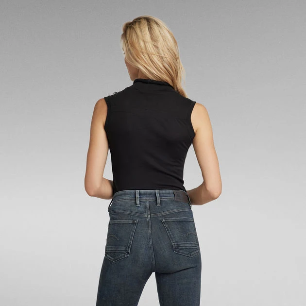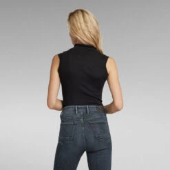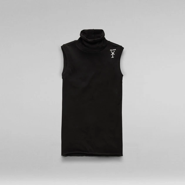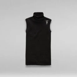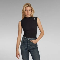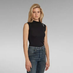 Sleeveless top Rib Mock Neck is designed in a slim fit and offers a turtleneck. A graphic print is added to the front shoulder as well as the lower back