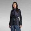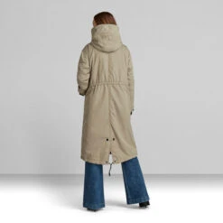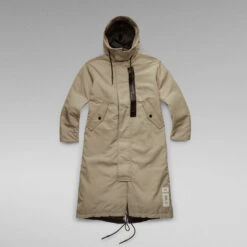 The Transition parka features a paneled hood with an extended, reinforced peak. Pull cords at the hood, inner waist and lower back hem offer adjustability. The zip front closure is covered by a storm flap to keep the wind out. Alongside, a G-Star RAW printed tape is set, concealing a chest pocket with zip. This padded parka offers flap pockets at the waist with a snap button closure. The extended back of this coat shows a fishtail finish. By closing the snaps above, the back can be transformed in to a straight hem.