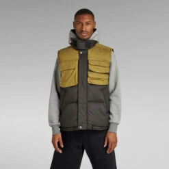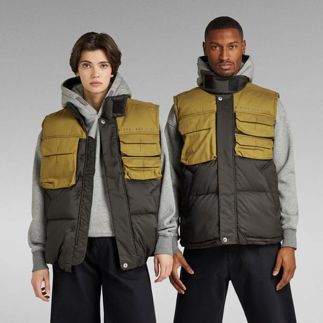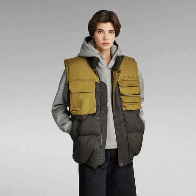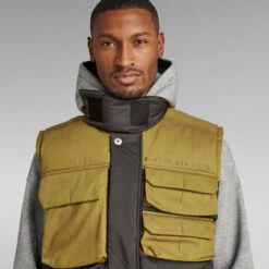 Utility vest Attac PM shows a raised collar with an extended tab. When a regular collar is preferred, this section can be folded back towards the Velcro patch. Flap pockets with a hidden snap closure are added to the chest. The ‘strike through’ embroidery stitch indicates the entrance. Welt pockets are added to the waist and offer a hidden snap as well. This sleeveless jacket features a 2-way zipper covered by a panel with snaps. Inside, an additional inner pocket and hanger loop are added for ease.