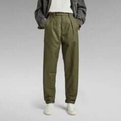 The Chino is designed in a loose fit and offers a pleated front. ‘Strike through’ embroidery stitches indicate the inset pockets. A coin pocket is integrated within. These chino’s show squared back pockets with a sewn-on button closure. Roll up the hems to complete the look.