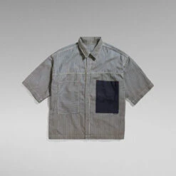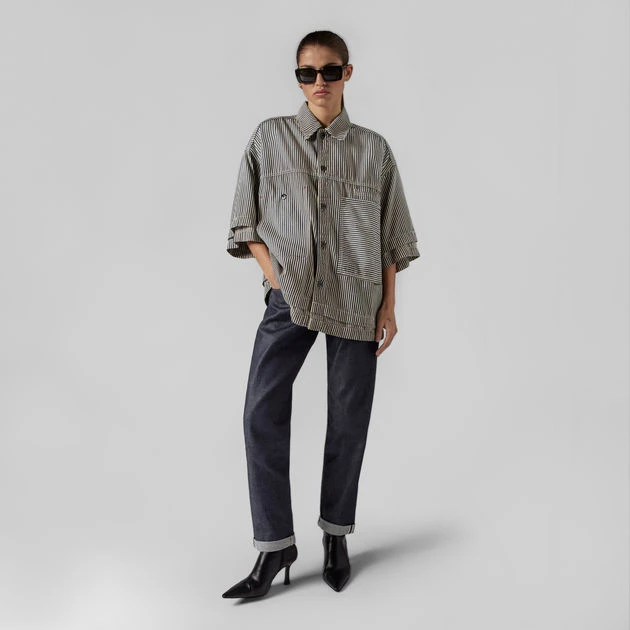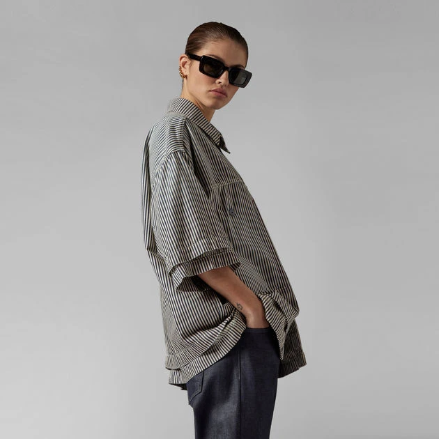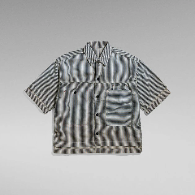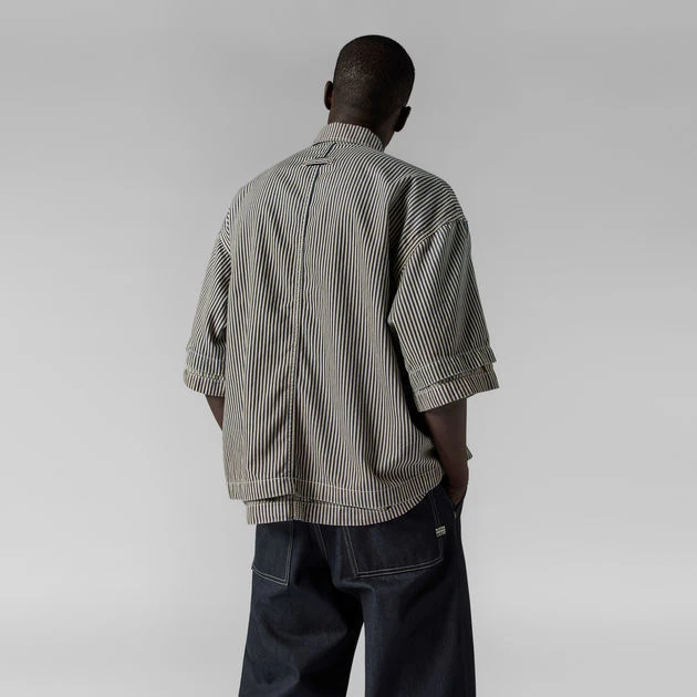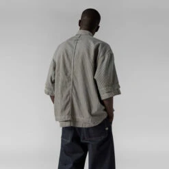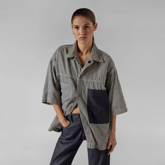 Premium shirt Double E is part of the Extremes collection, where timeless pieces are created by merging innovation with craftsmanship. This unisex striped shirt is designed in a double layer. Visible through the sleeves and bottom hem where the second layer pops out. At the chest, a double pocket construction is created. The opposite side offers an inner pocket, visible through the stitch down and snap button closure on the outside. The loop at the back completes it.