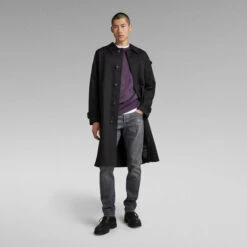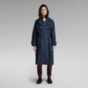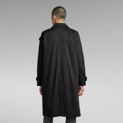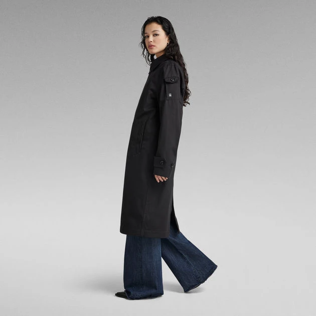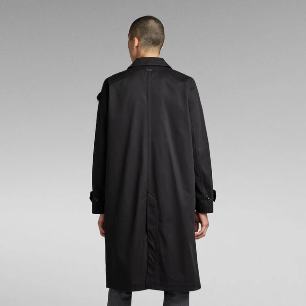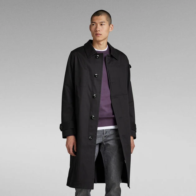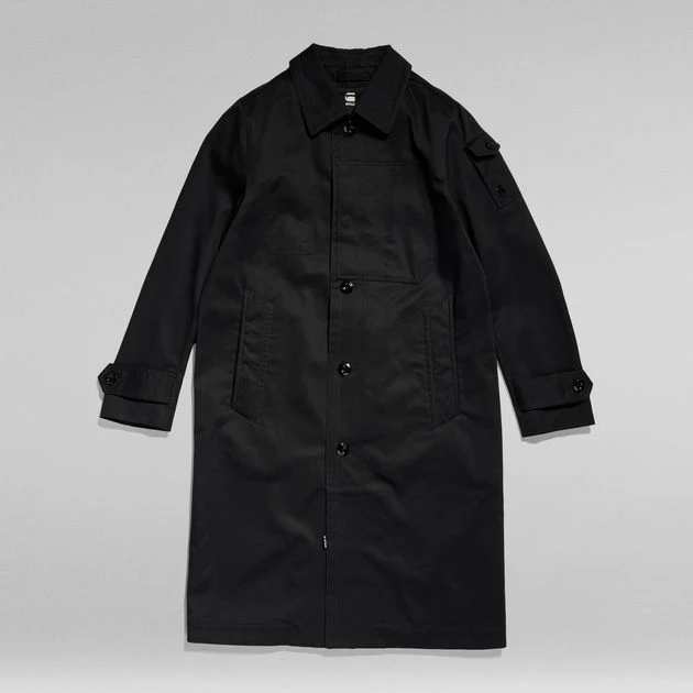 This Trench is designed in a straight fit that reaches the knee. Aside broad welt pockets at the waist, this trench also offers a chest pocket with a side entry. An inner pocket is visible through the stitching on the other side of the chest. By adjusting the straps at the sleeves, a narrower cuff can be created. This unisex trench coat shows another pocket at one of the sleeves. The slit at the back offers a hidden snap button to reduce the opening when preferred.