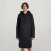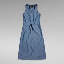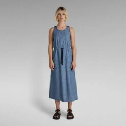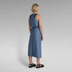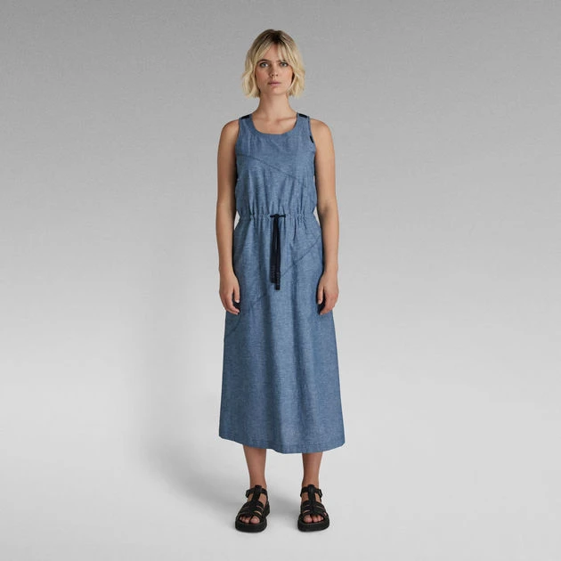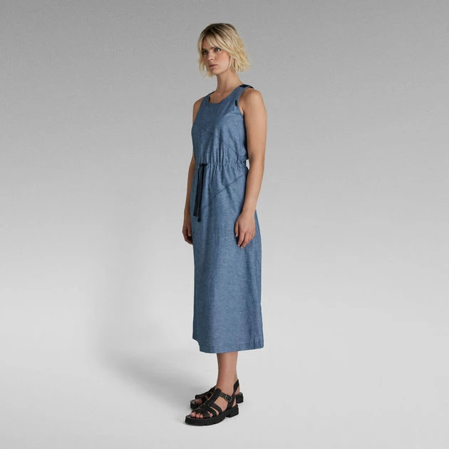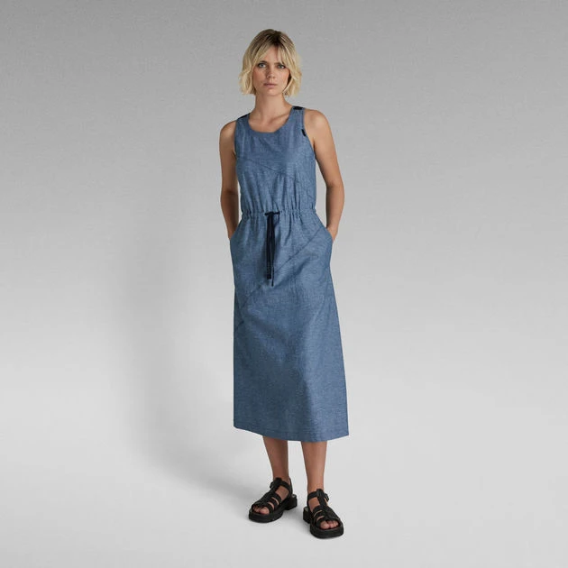 Sleeveless dress Utility offers a straight fit with a slightly flared skirt. Diagonal design lines are emphasized by the additional stitching on top. This midi dress shows several rows of stitching around the neck. Woven tapes reinforce the shoulders and proceed towards the back. A slim tape is added to the waist to allow for a tighter fit. Pockets are incorporated in the side seams.