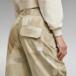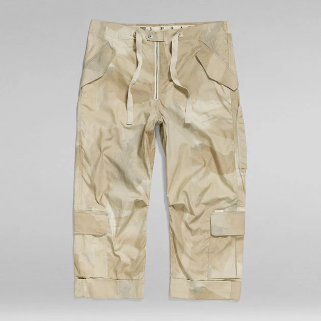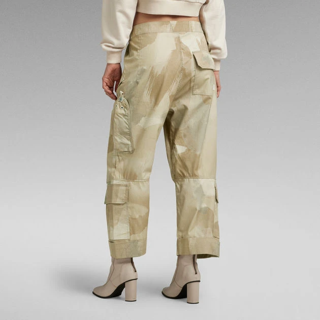 These utility pants offer a wide fit in a cropped length. A woven tape is applied at the high waist and is combined with a hidden zipper closure, a tab and snap. These cropped pants show inset pockets and flap pockets at the lower legs. At the back, a single flap pocket is combined with another pocket at the upper leg. The leg hems have a folded finish.