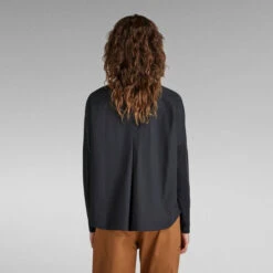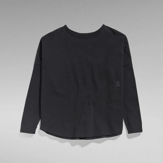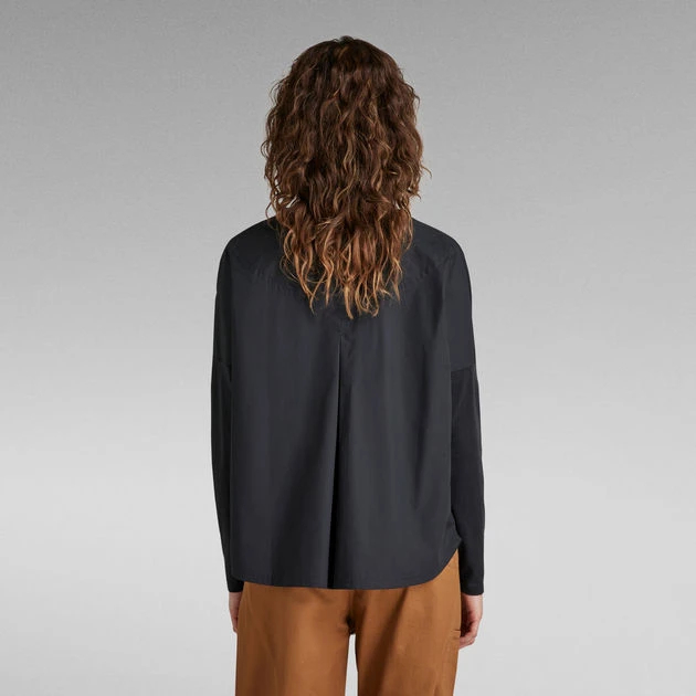 This loose fitting top combines a jersey front with a poplin back panel. Comfortably designed with grown on sleeves and a ribbed neckline. This top offers an embroidered graphic with printed details at the waist. A curved stitch down is added to the upper back. The deep pleat set underneath adds to the wider fit.