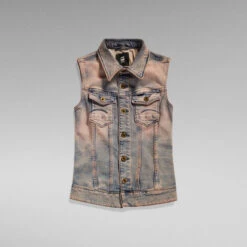 This denim sleeveless jacket is part of our limited edition Y2K collection which features styles from the 00’s, taken straight from our archive. This denim piece is designed in a slim fit and offers western inspired chest pockets. The bottom hem is rounded at the front and straight at the back. This sleeveless denim jacket has a shank button closure.